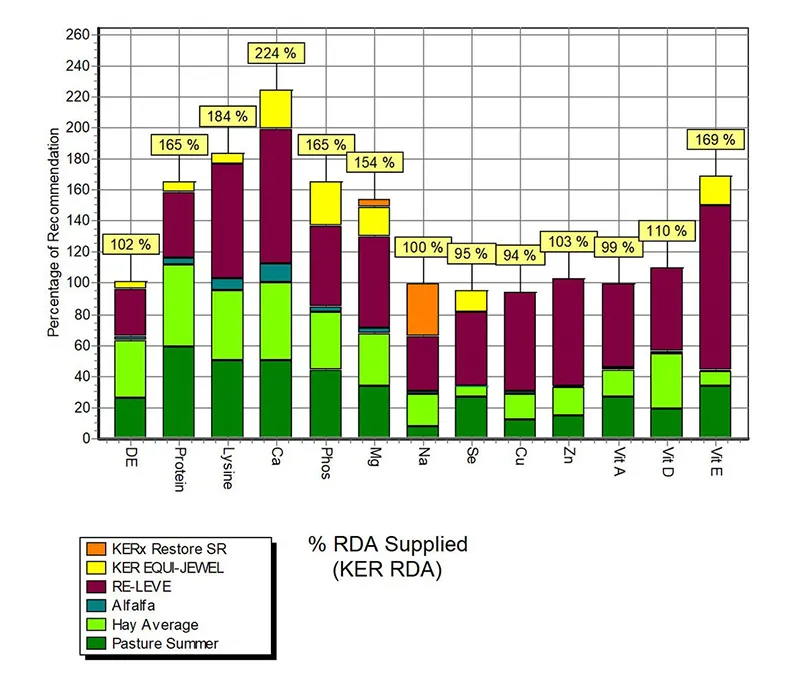 MicroSteed™ clearly identifies the relative contribution of each element of the feed program against the horse’s requirements. The contribution of nutrients from feeds such as RE-LEVE® is fixed, whereas the contribution from forage and pasture is often naturally variable and so actual daily intake will vary. For this reason, each nutrient has an optimum range rather than a fixed target to achieve.