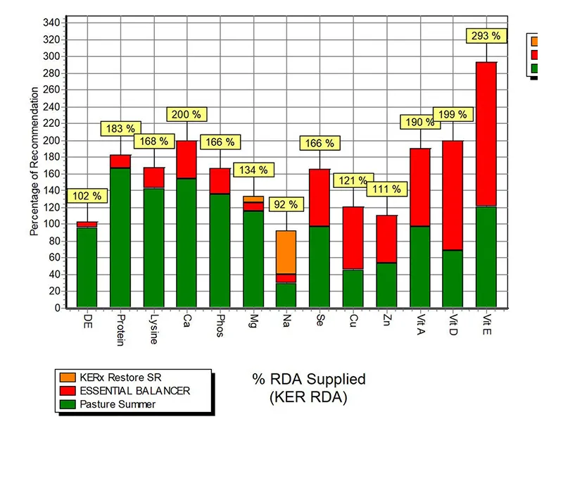 In the example diet the balance of energy is almost evenly split between protein, carbohydrate and fibre. Pasture during the summer months is naturally high in protein in sugar as well as providing fibre. Essential Balancer at 500g makes very little contribution to energy, its main role is provision of vitamins, minerals and supplements such as yeast.