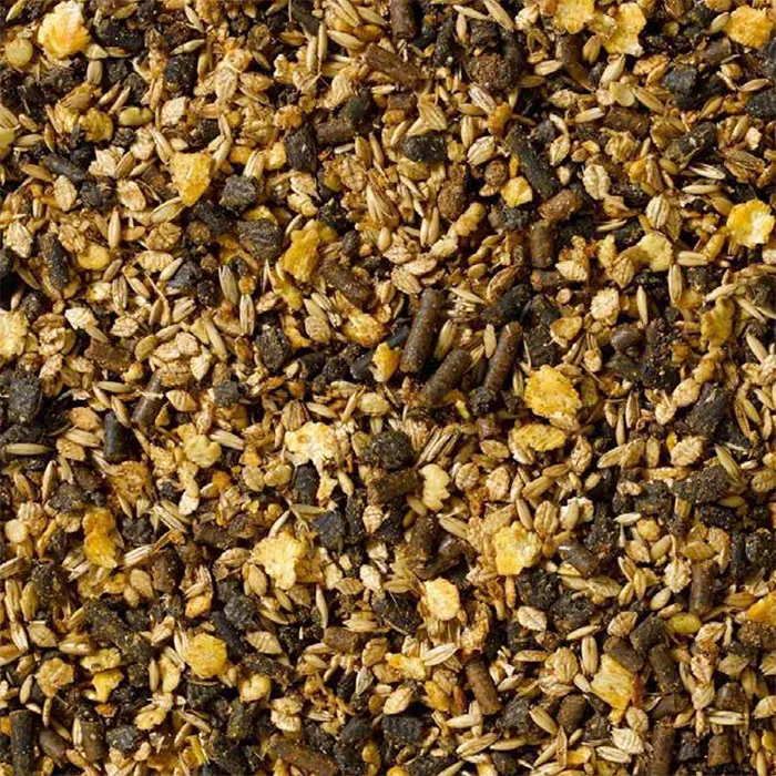 Crude Fibre - 12.5%, Crude Protein - 11.0%, Lysine - 0.6%, Methionine - 0.2%, Crude Oil - 10.0%, Crude Ash - 7.3%, Starch - 20.0%, Sugar - 6.0%, Digestible Energy - 13.6 MJ/kg