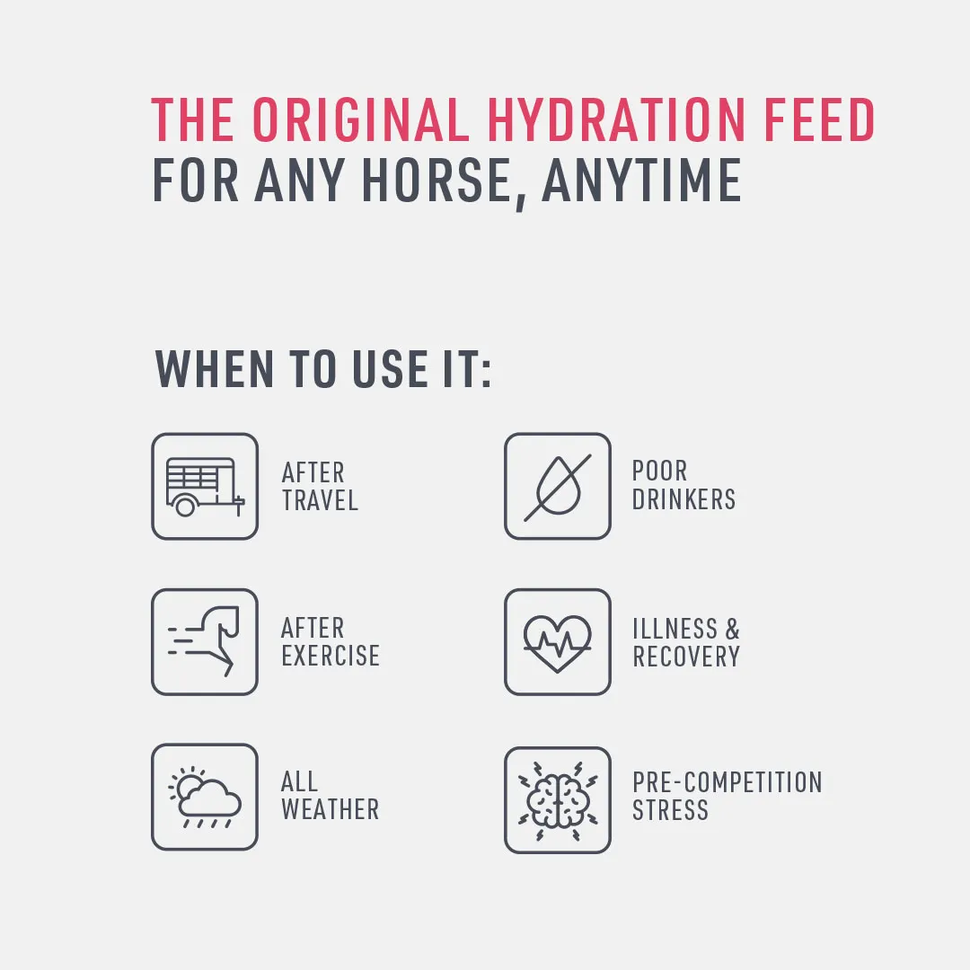 A versatile hydration mash supporting fluid intake, gut health and recovery in horses across all conditions and disciplines.