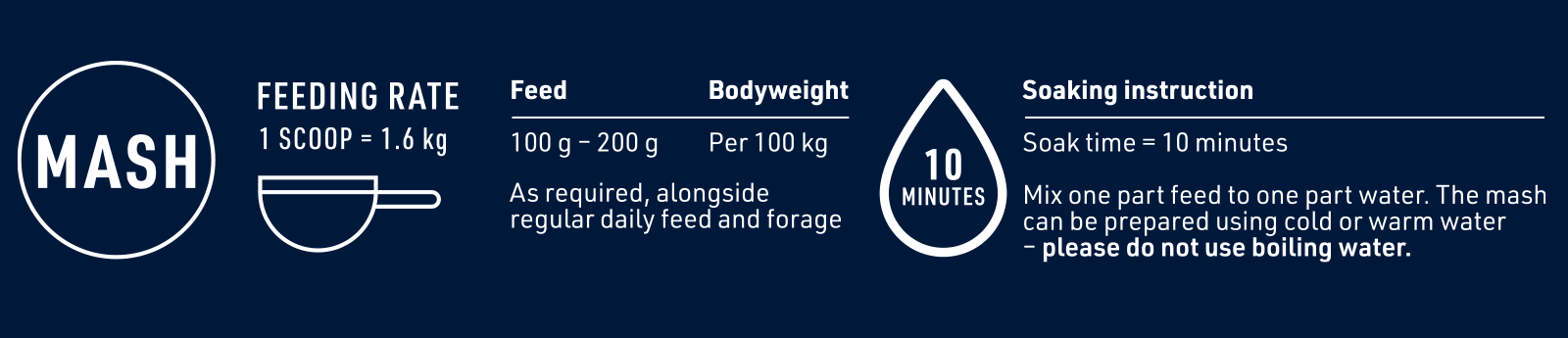 Low starch (13%), fully fortified mash, which provides key nutrients for optimum recovery and fluid intake.