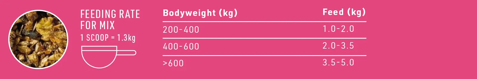 Crude Fibre - 15.5%, Crude Protein - 14.0%, Lysine - 0.69%, Methionine - 0.20%, Crude Oil - 7.0%, Crude Ash - 7.9%, Starch - 16.0%, Sugar - 6.0%, Digestible Energy - 12.6 MJ/kg