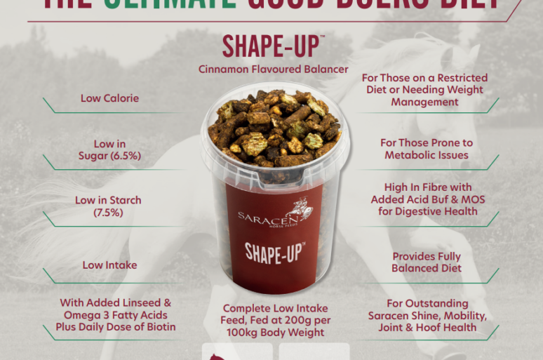 SHAPE-UP™ is a low starch, high fibre calorie controlled balanced designed to offer a full spectrum of vitamins and minerals even at low intake levels. Formulated as an appetising muesli mix it can be used as a calorie controlled ration for good doers as well as equines prone to laminitis, equine metabolic syndrome or Cushings as a way to help maintain a normal, healthy, metabolism.