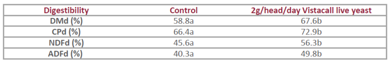 DM, OM, NDF and ADF digestibility were significantly improved (P<0.05). Crude protein and crude fat digestibility also tended to be increased.