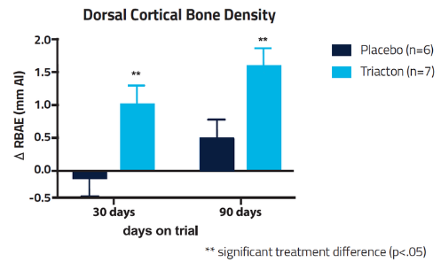 Research into racehorses in training supplemented with Triacton, a supplement containing BMC® plus other key vitamins, was proven effective at increasing bone density after just 90 days of supplementation. Feeding Triacton increased the density of the dorsal cortex of the cannon bone by three-fold whilst also doubling bone thickness and increasing bone area.