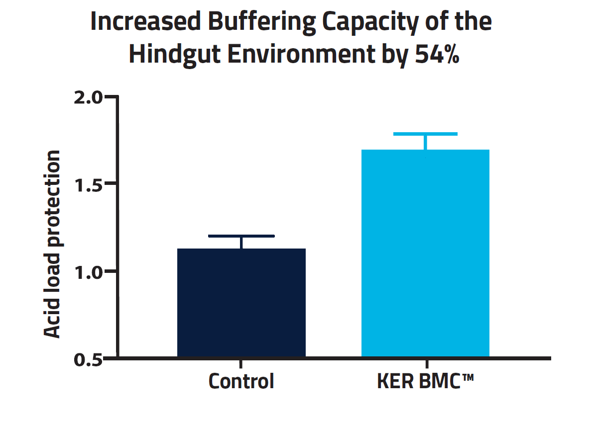 BMC® also supports hindgut health through buffering acidity found within the hindgut. As thoroughbred diets generally require a higher intake of hard feed to meet elevated nutrient requirements, the risk for hindgut acidosis is higher. Changes in hindgut pH negatively affect the bacteria that reside in the hindgut and are responsible for digestion. Through helping to maintain the optimum pH for beneficial bacteria BMC® supports digestive function. BMC® is proven to increase the buffering capacity of the hindgut by 54%.