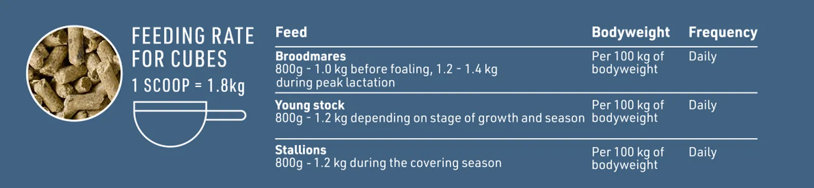 STUD CUBES are a complete, fortified feed ideal for breeding stock and young horses, delivering key nutrients to support optimal growth, fertility and digestive health.